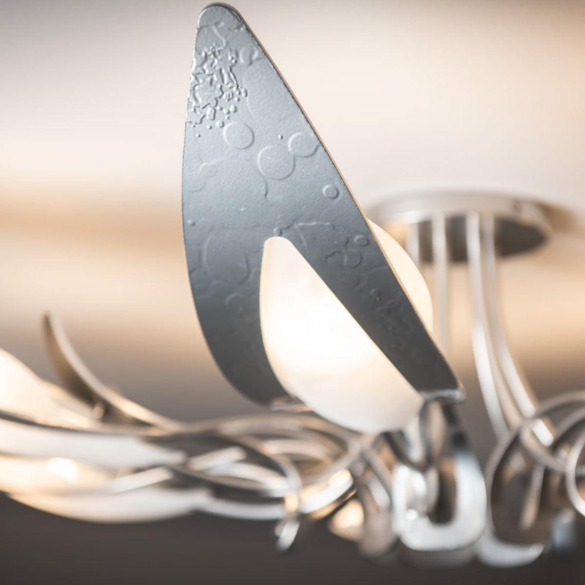 A beautiful way to illuminate any room, the Parasol semi-flush fixture is both delicate and impressive. Each arm was designed to nest a piece of slumped art glass to great effect. According to HF designer Jason Hancock, a "milky" candelabra bulb is the ideal choice to give this fixture the most elegant look.