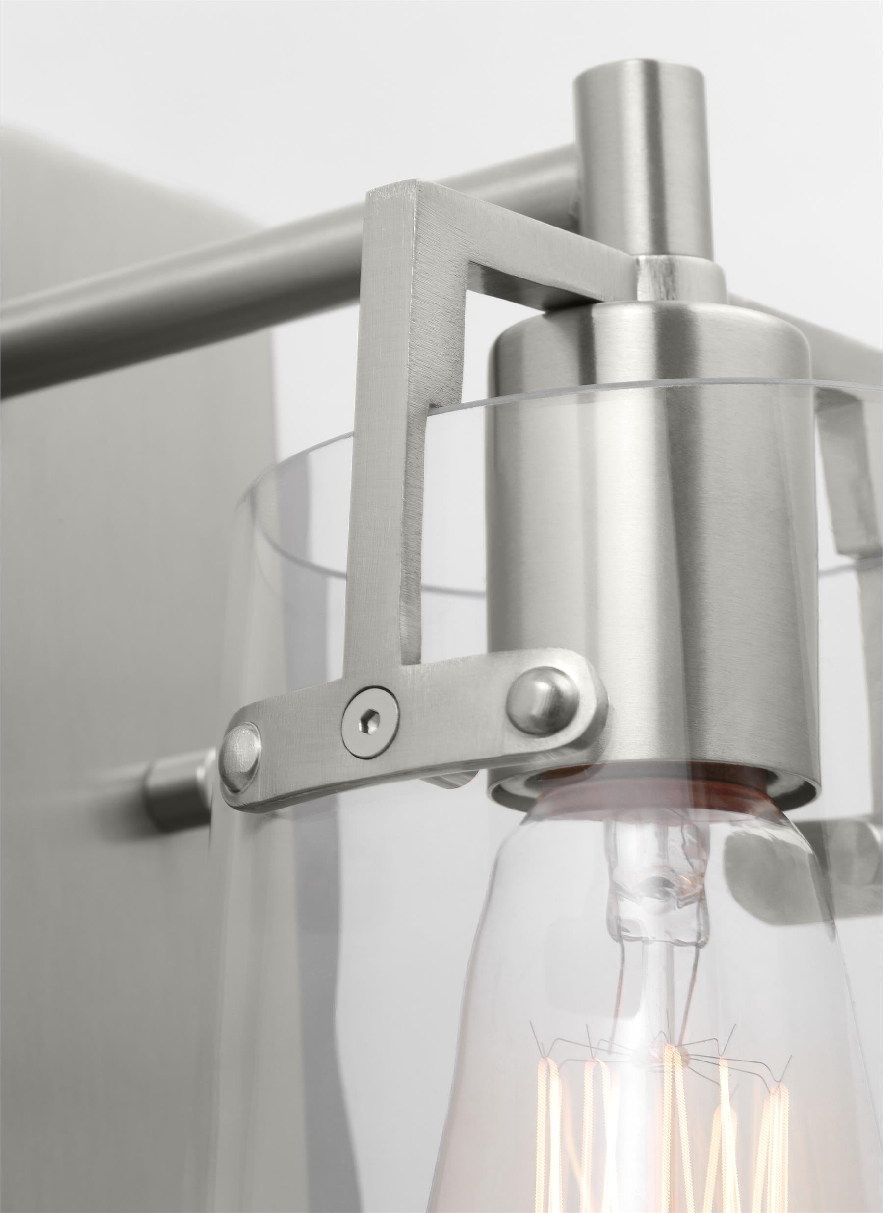 Drew & Jonathan Scott's Crofton collection fits a modern or Modern Farmhouse room, bringing pizazz in several sizes and finish options. The clear glass shades slip into a squared yoke, available in wall and pendant options in Satin Brass, Brushed Steel, Chrome or Mid-Night Black finish.