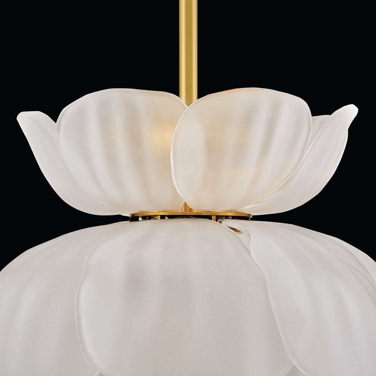 Fantine’s flowing blooms are inspired by preserved flowers suspended in time. Uniquely shaped artisan-sculpted glass arranged in lush layers creates an ethereal dance of light and shadow. An exaggerated canopy and slender stems are crafted from solid brass in a hand-touched Unlacquered Brass finish.