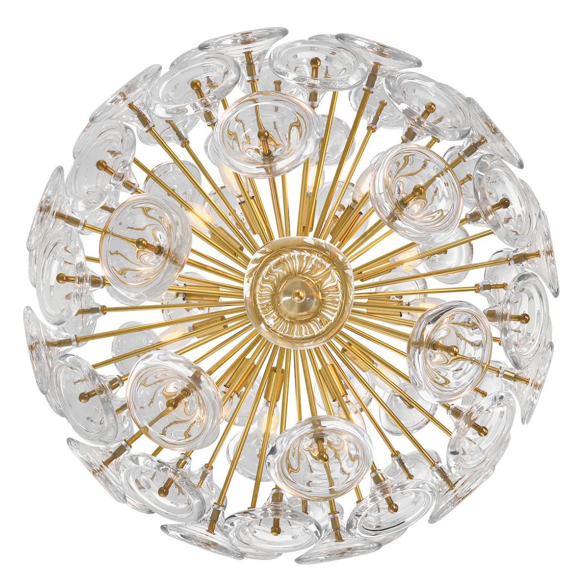 Capturing the essence of natural elegance seen through a contemporary lens, Maya’s hand-blown trumpet blossoms are artfully arranged in radiant bouquets to cast an enchanting aura. Intricate solid brass frames suspended from minimal stems and canopies are hand-painted in a chic Unlacquered Brass finish, adding a classic touch to your décor palette.