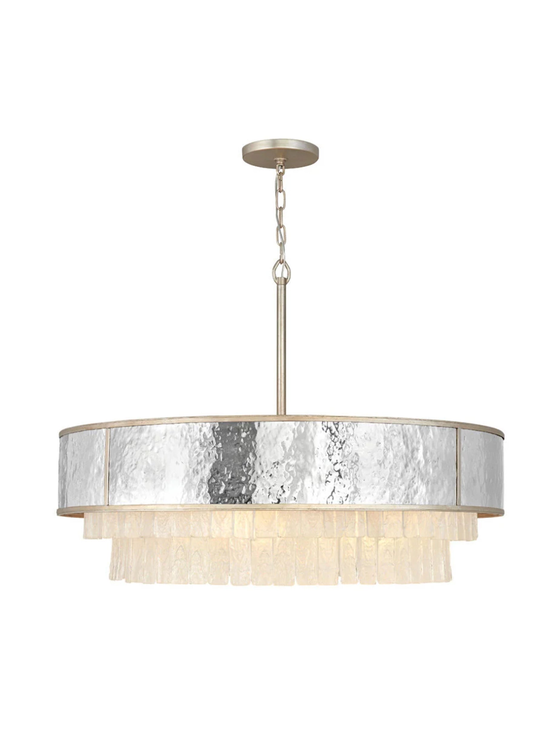 Reverie features a fanciful combination of finishes and shapes to create an opulent transitional silhouette. The robust, hammered stainless steel drum encompasses the textured crystal accents, which create a stunning profile from below. Metal binding adds an artisan touch that completes the look.