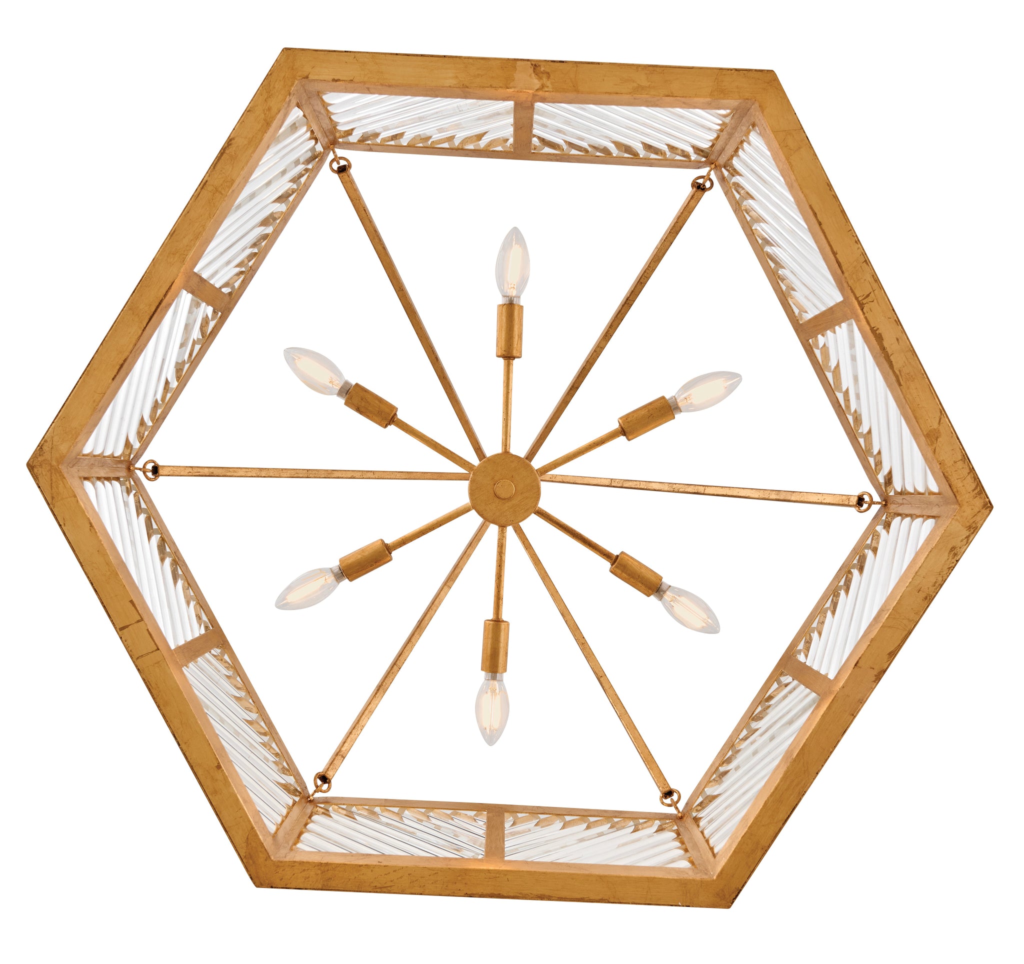 A reimagining of vintage designs from the 40s and 50s, Sura’s transitional, hexagonal Distressed Brass frame creates a glamorous yet understated and tailored appeal. Cylindrical glass rods set at alternating angles echo a soft herringbone pattern, juxtaposing geometry within geometry. Layered details create a reeded effect that is reflective and alluring.