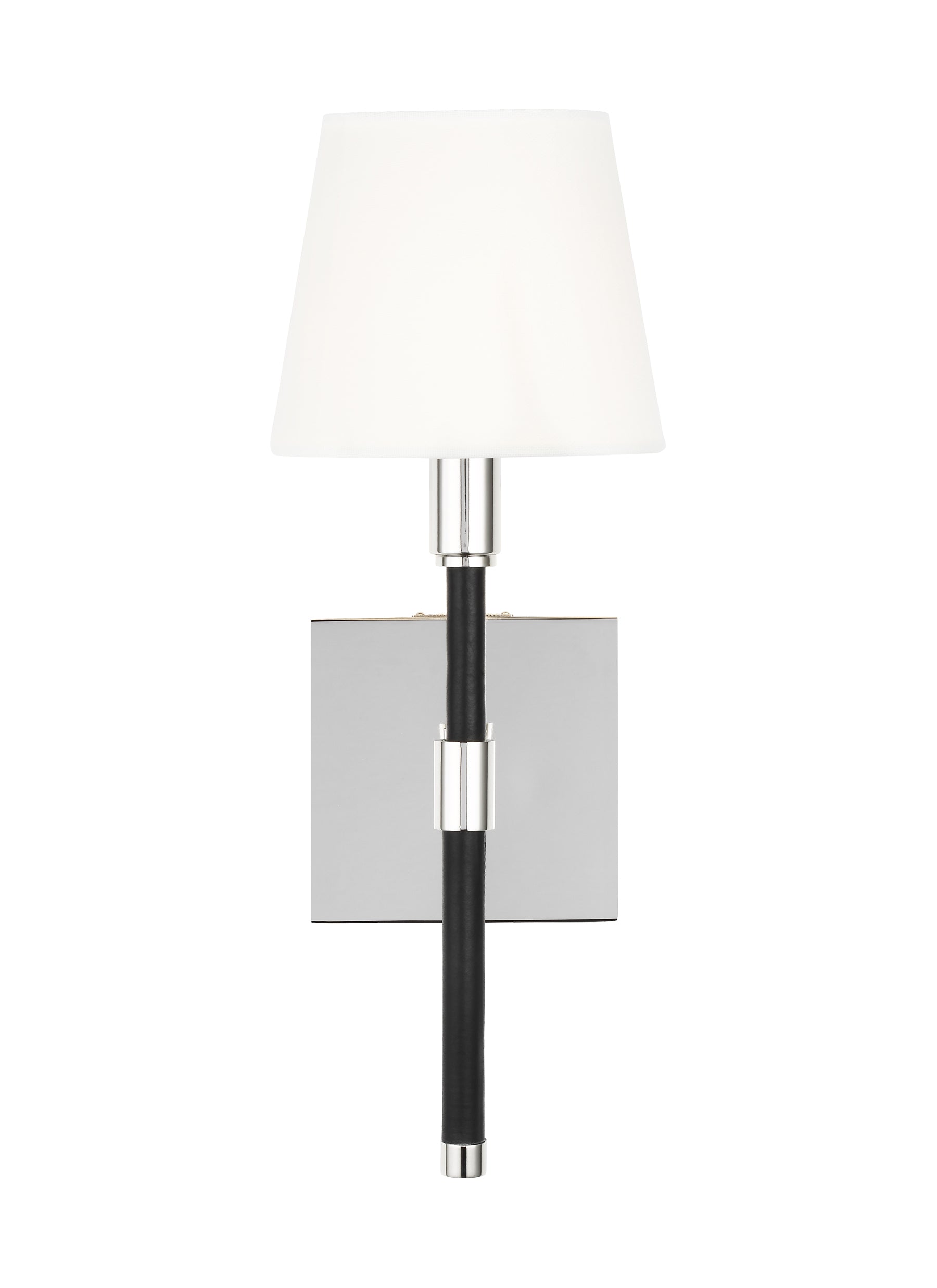 The Katie sconce has real hand-stitched leather accents and white linen fabric shades. Available in two finishes and is damp rated.