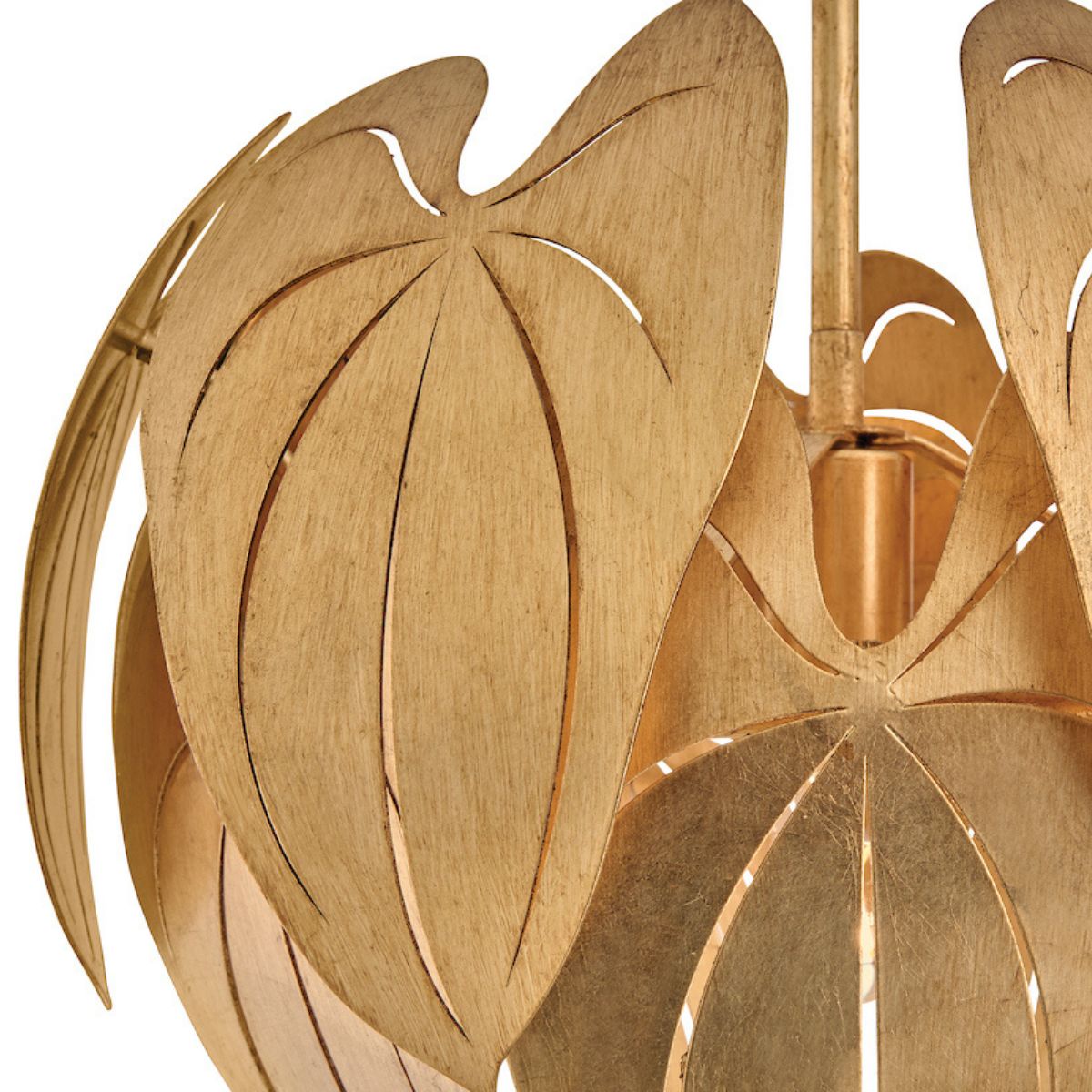 Inspired by the grand leaves and distinct veining of anthurium plants, found in the tropical cloud forests of South America, Camille brings botanical beauty to your living space. Each Distressed Brass layer is artfully laser-cut, shaped, and hand-painted with gold leaf to create a luxe transitional design, suspended by diamond-shaped chains and a tapered canopy.