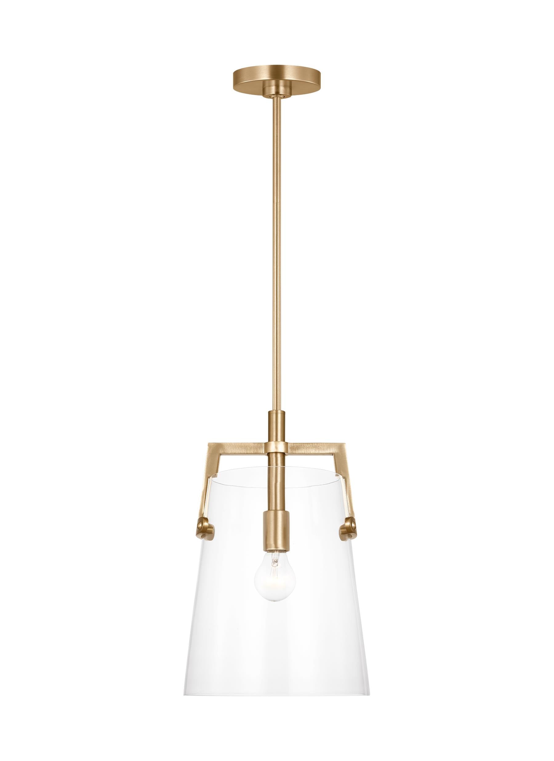 Drew & Jonathan Scott's Crofton collection fits a modern or Modern Farmhouse room, bringing pizazz in several sizes and finish options. The clear glass shades slip into a squared yoke, available in wall and pendant options in Satin Brass, Brushed Steel, Chrome or Mid-Night Black finish.