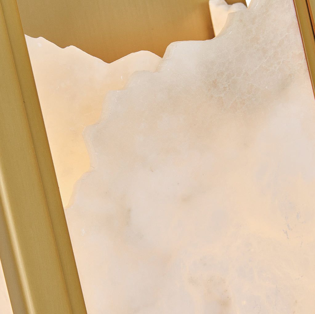 Inspired by snowy mountain peaks, Veleta’s natural alabaster shade with jagged top edges is showcased by a geometric Lacquered Brass frame. Truly one-of-a-kind graining, color variations, and organically formed textures make each Veleta fixture genuinely unique.