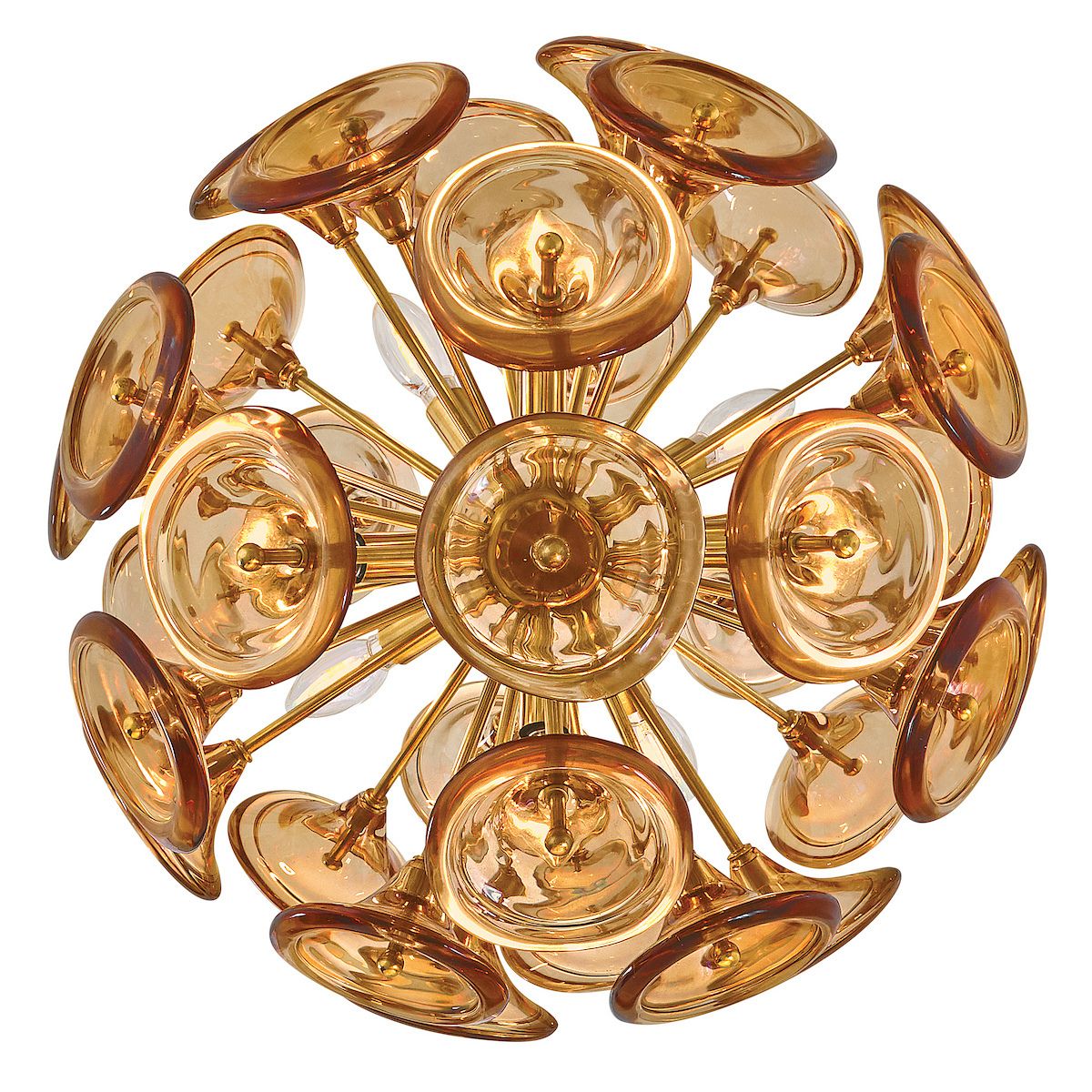 Capturing the essence of natural elegance seen through a contemporary lens, Maya’s hand-blown trumpet blossoms are artfully arranged in radiant bouquets to cast an enchanting aura. Intricate solid brass frames suspended from minimal stems and canopies are hand-painted in a chic Unlacquered Brass finish, adding a classic touch to your décor palette.