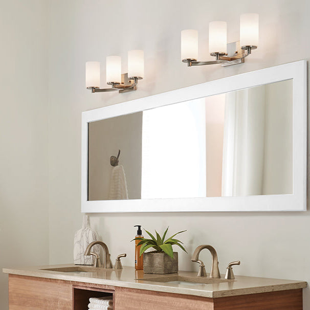 Modern and well crafted, the Hettinger collection from Visual Comfort Generation is priced for commercial applications and fits into most household budgets. The vanity fixtures are available in a variety of sizes and finishes. The minimal design, with crisp etched white glass, also fits into most room aesthetics.