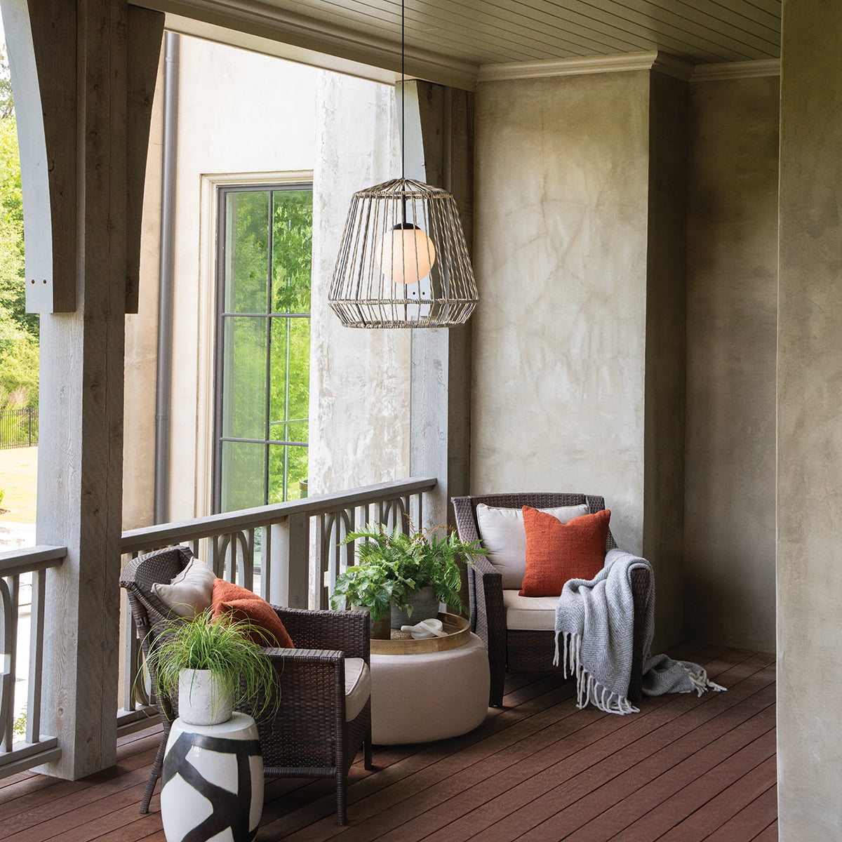 Cool and coastal-inspired, Arlen features a woven, all-weather rattan shade perfect for entertaining in al fresco dining spaces. The natural texture and neutral tones are complemented by a chic black canopy.