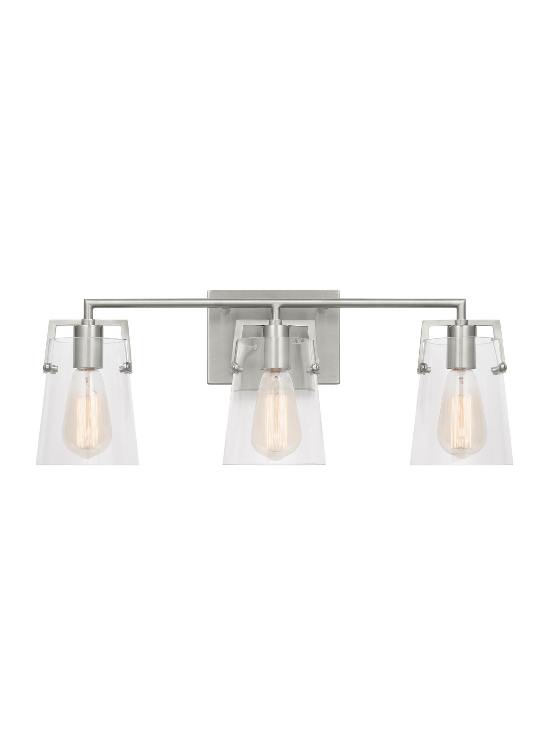 Drew & Jonathan Scott's Crofton collection fits a modern or Modern Farmhouse room, bringing pizazz in several sizes and finish options. The clear glass shades slip into a squared yoke, available in wall and pendant options in Satin Brass, Brushed Steel, Chrome or Mid-Night Black finish.