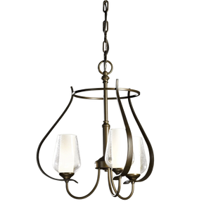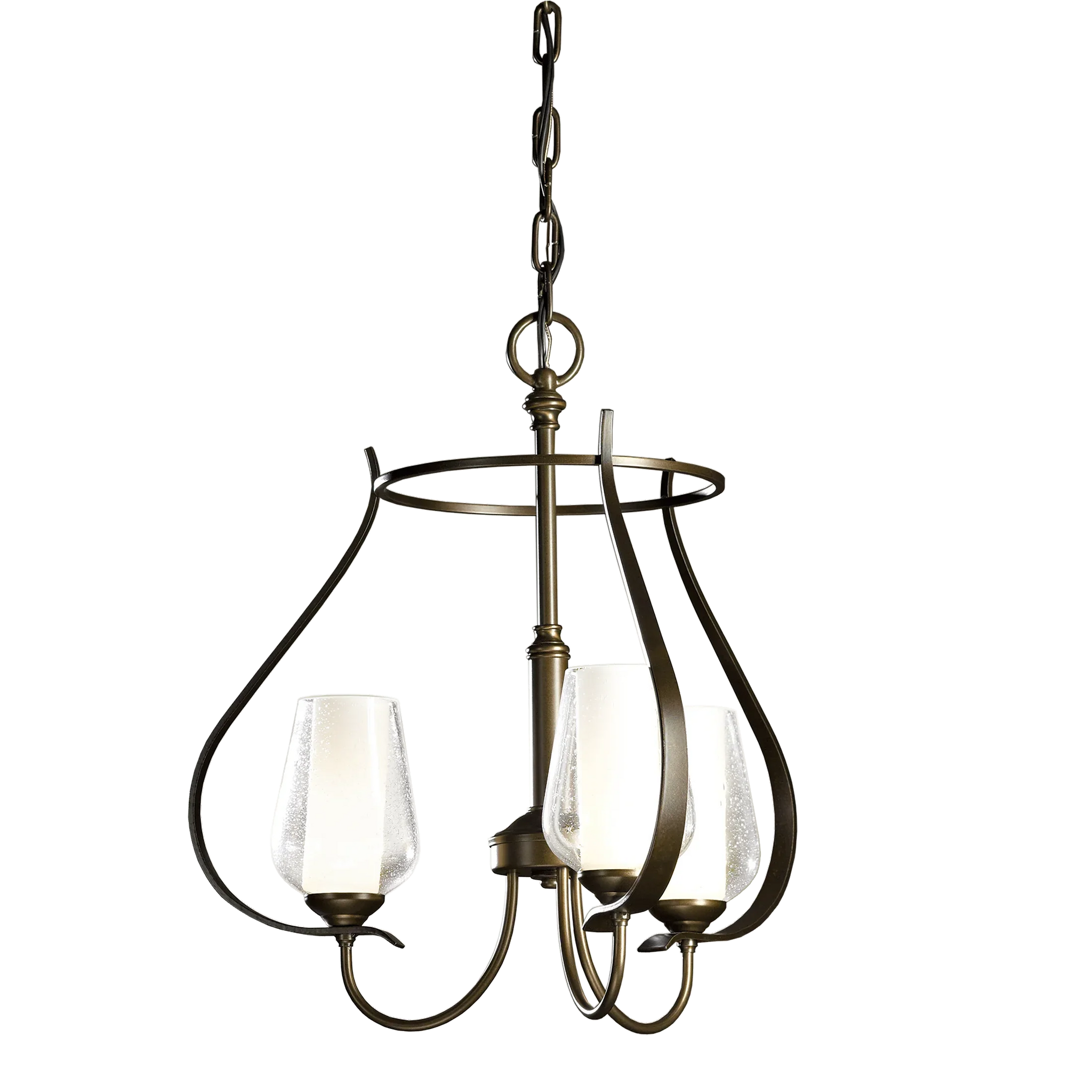 This three-armed chandelier showcases our Vermont forge work. From the circlet crowning the piece, to the bands swooping down, to the round bars that sprout the glass, the hand-shaped steel delivers curve after curve.
