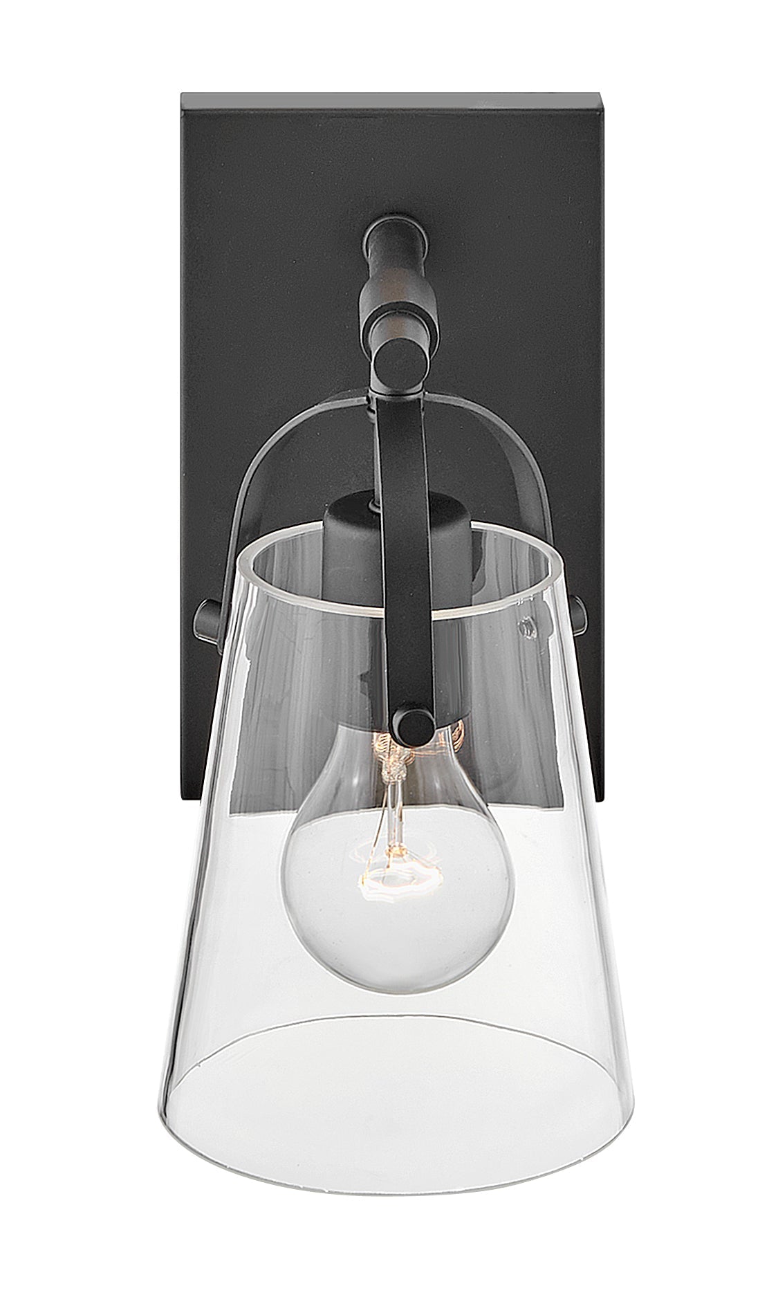 Clean and airy, Foster breathes composed simplicity into a bath space. Softly tapered clear glass, suspended from an arched handle, adds pizzazz to its transitional shape. Ideal for filament bulbs.